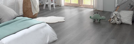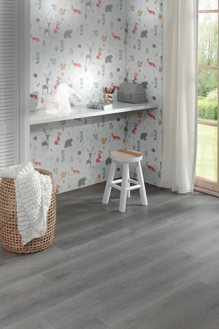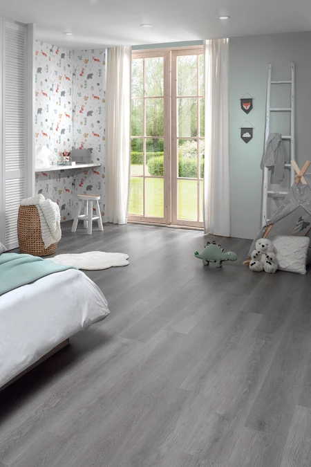 Ein grauer Boden im Kinderzimmer? Eine ideale Kombination! So können Sie noch tolle Akzente setzen, wie bei diesem Projekt. Hier wurde mit Grün kombiniert. Verändert sich das Kinderzimmer in ein lässiges Jugendzimmer? Cool! Mit diesem Vinylboden haben Sie zahlreiche Möglichkeiten! Das zeitlose Grau und die modernen Bretter schaffen einen Look, der jahrelang hält!